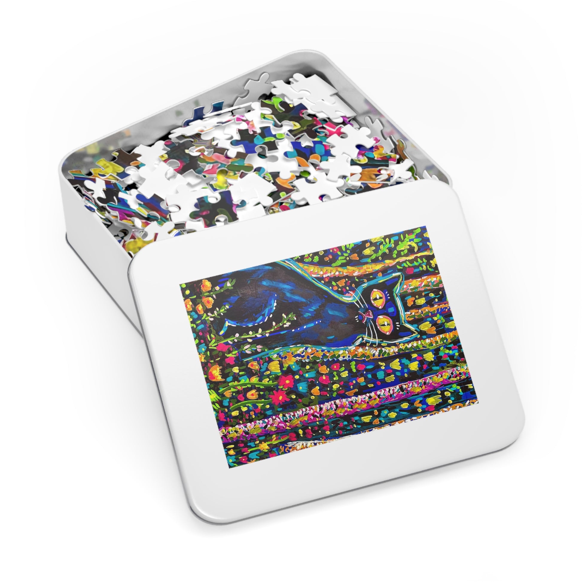 Cat in the Garden — Colorful Art Jigsaw Puzzle with Tin